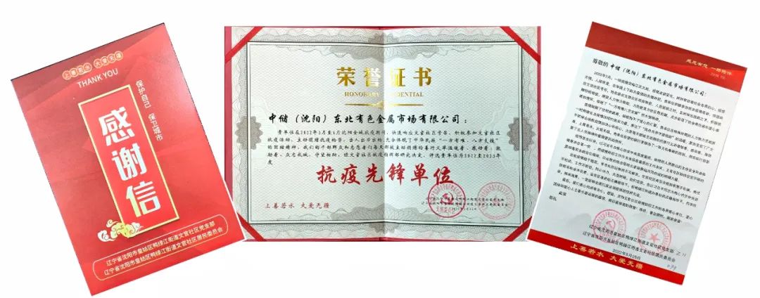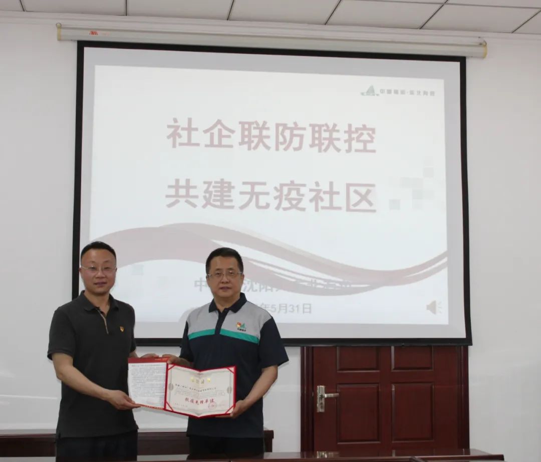 2022年5月31日,皇姑区鸭绿江街道文官社区赵宇书记来访公司,授赠中储东北有色“2022年度抗疫先锋单位”荣誉证书,表彰公司在疫情防控期间,全面配合街道、社区做好抗击疫情工作,以实际行动融入共建共防体系,诠释志愿服务精神,彰显央企责任担当。